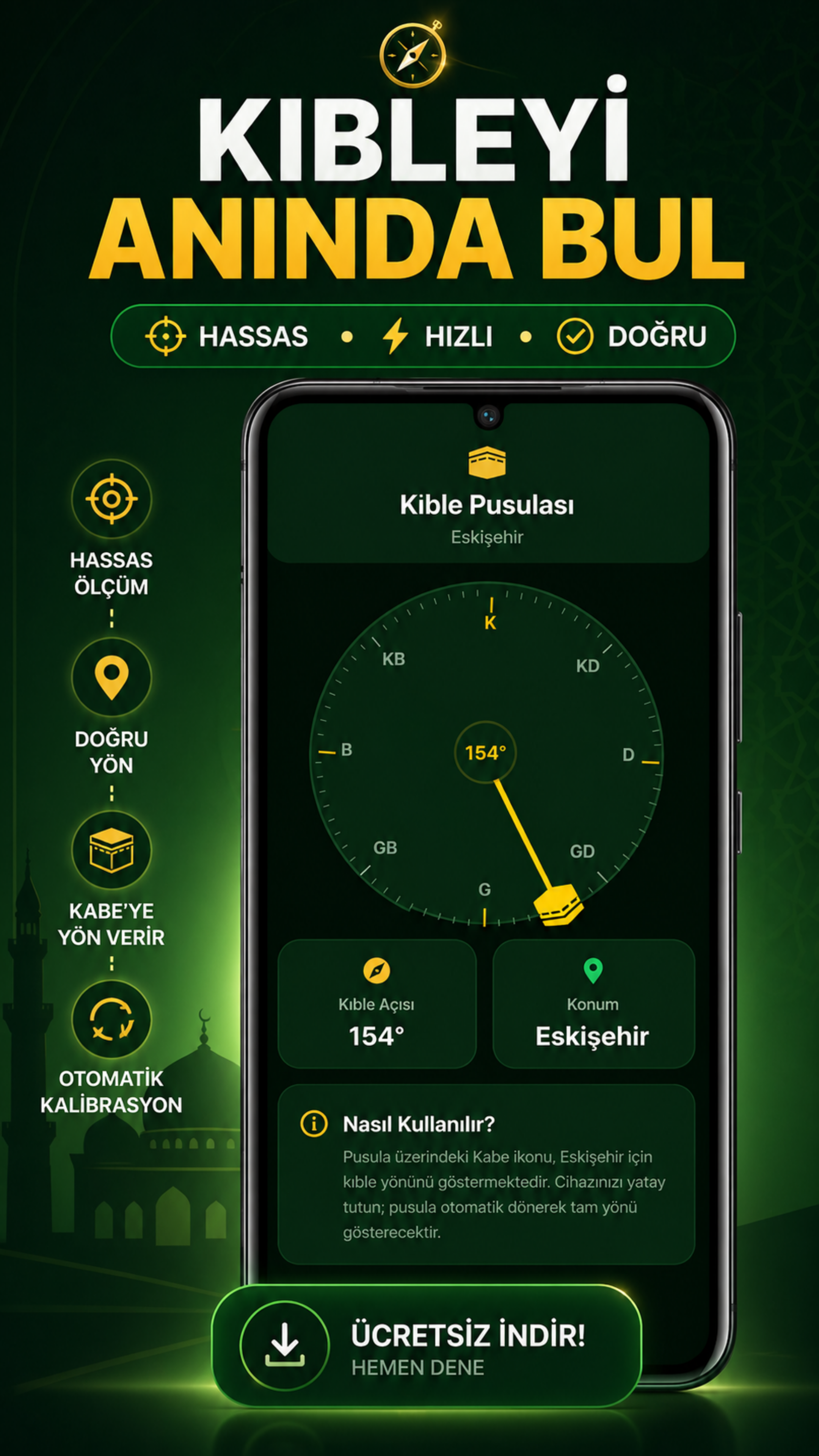 Dünyanın neresinde olursanız olun, gelişmiş pusula ile kıblenizi saniyeler içinde bulun.