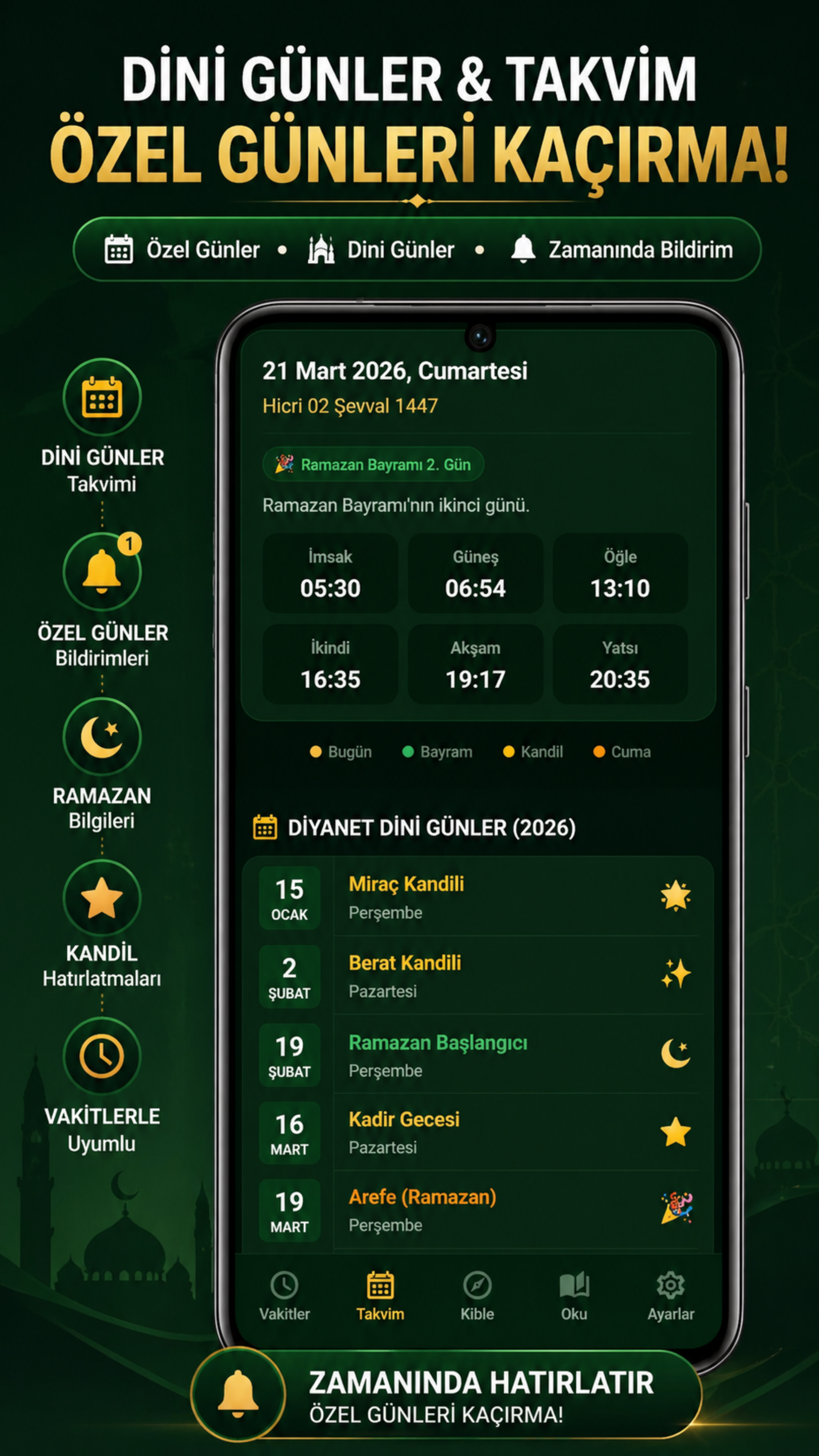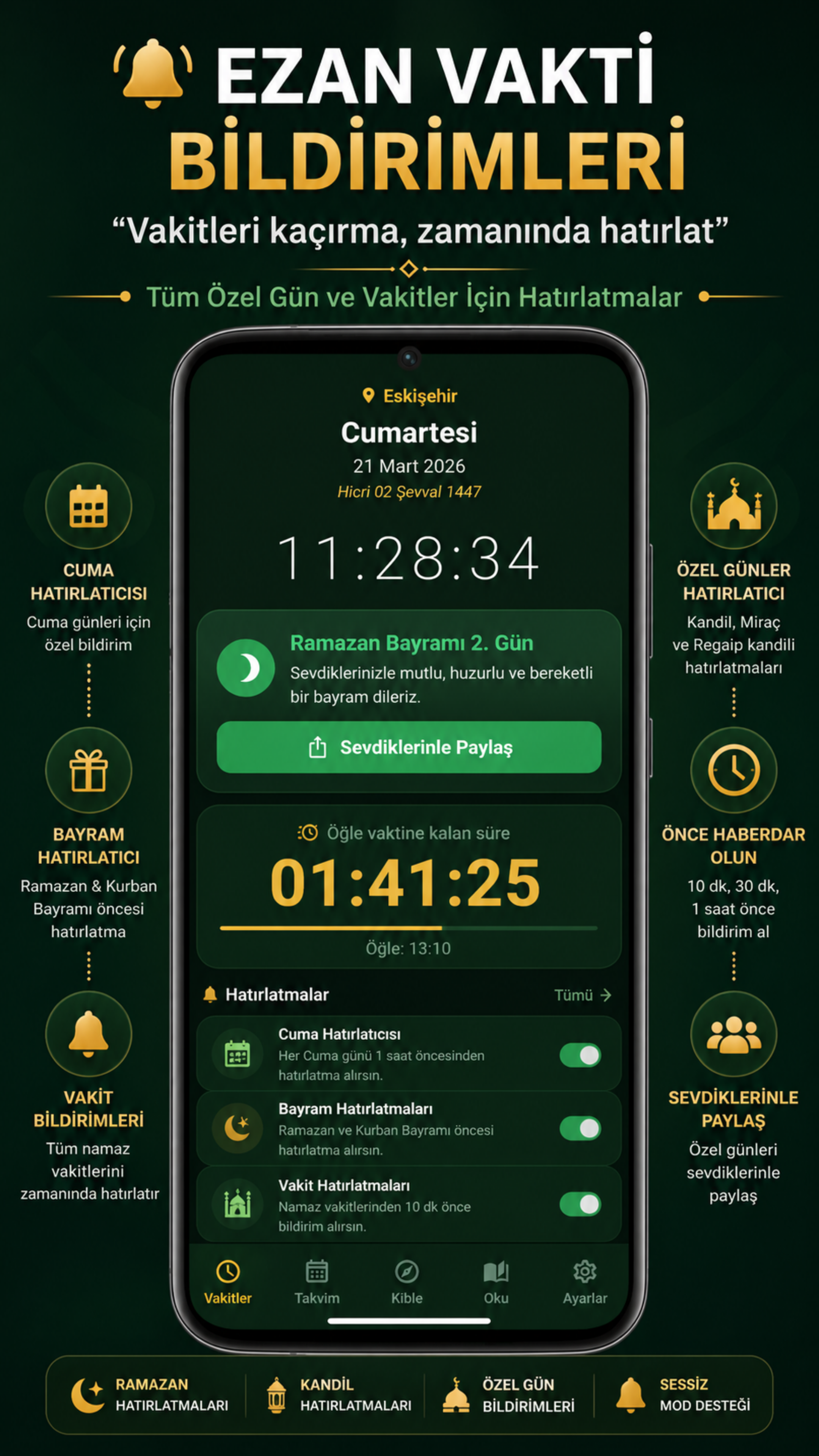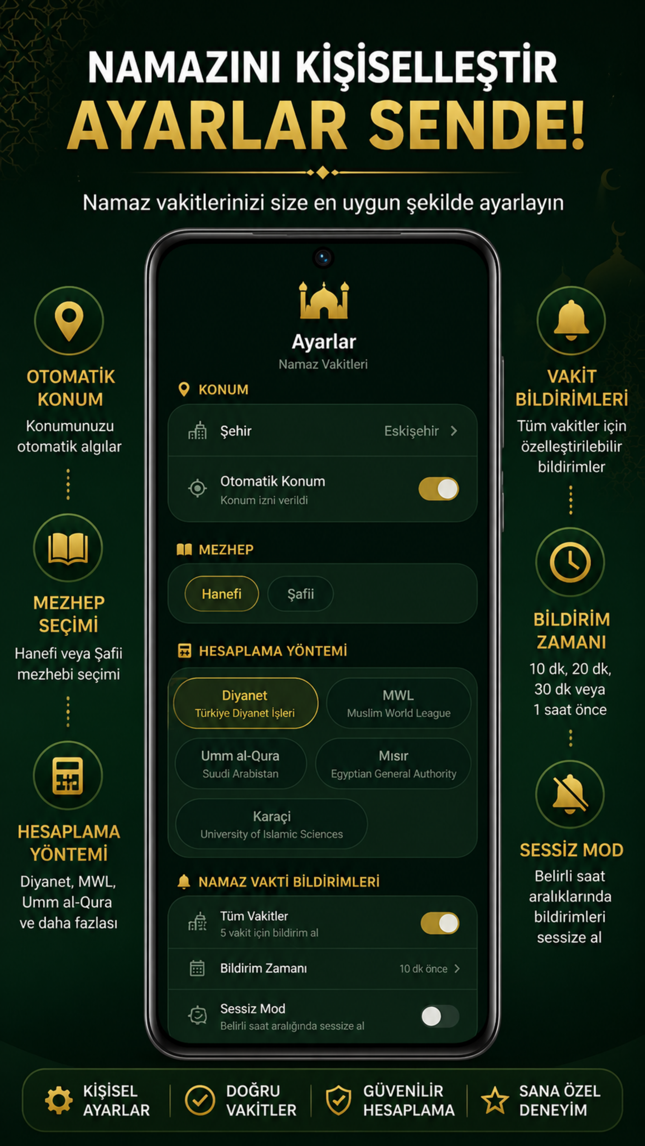 Diyanet ile tam uyumlu, konumunuza özel kesin namaz vakitleri ve bildirimler.