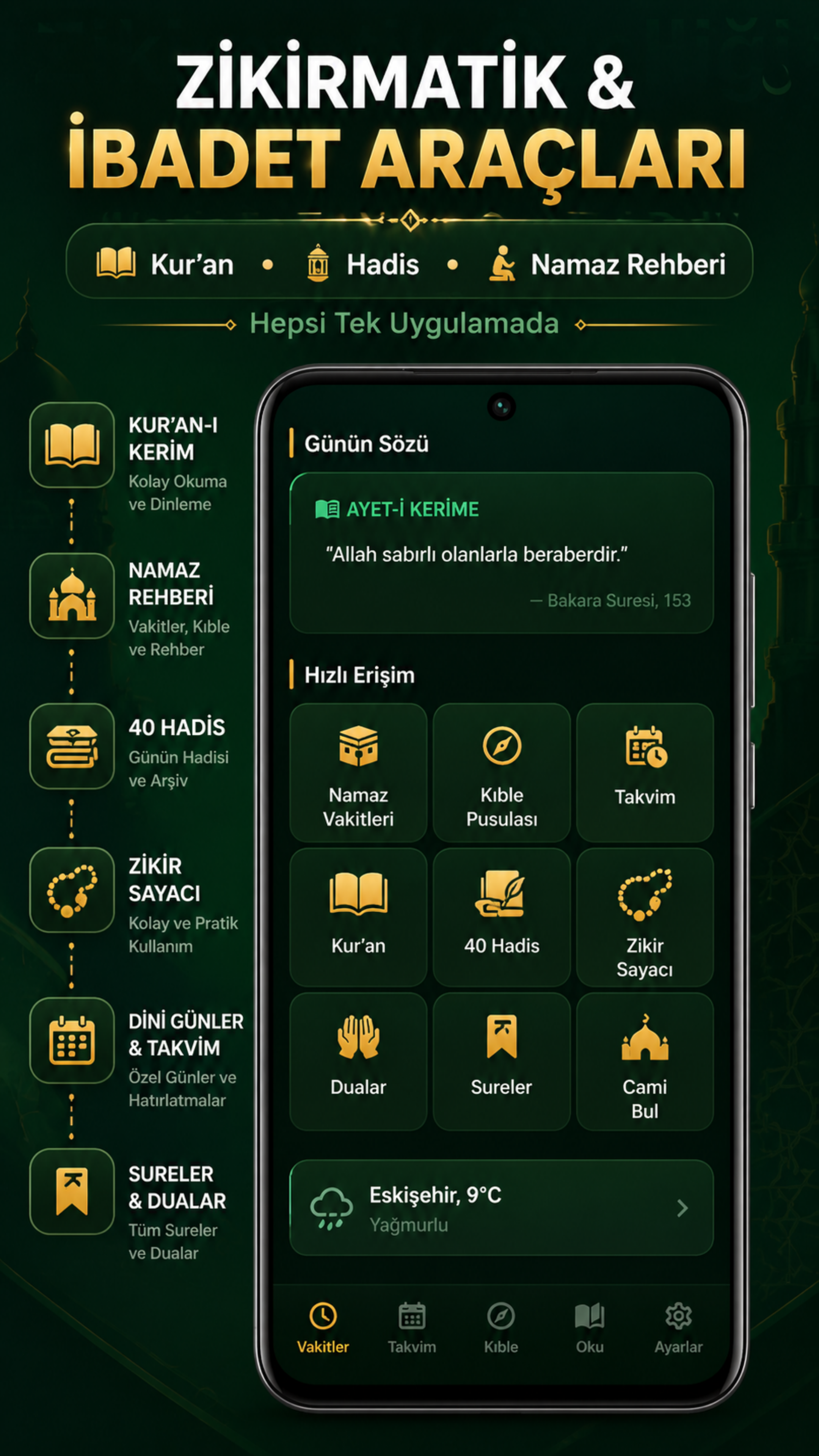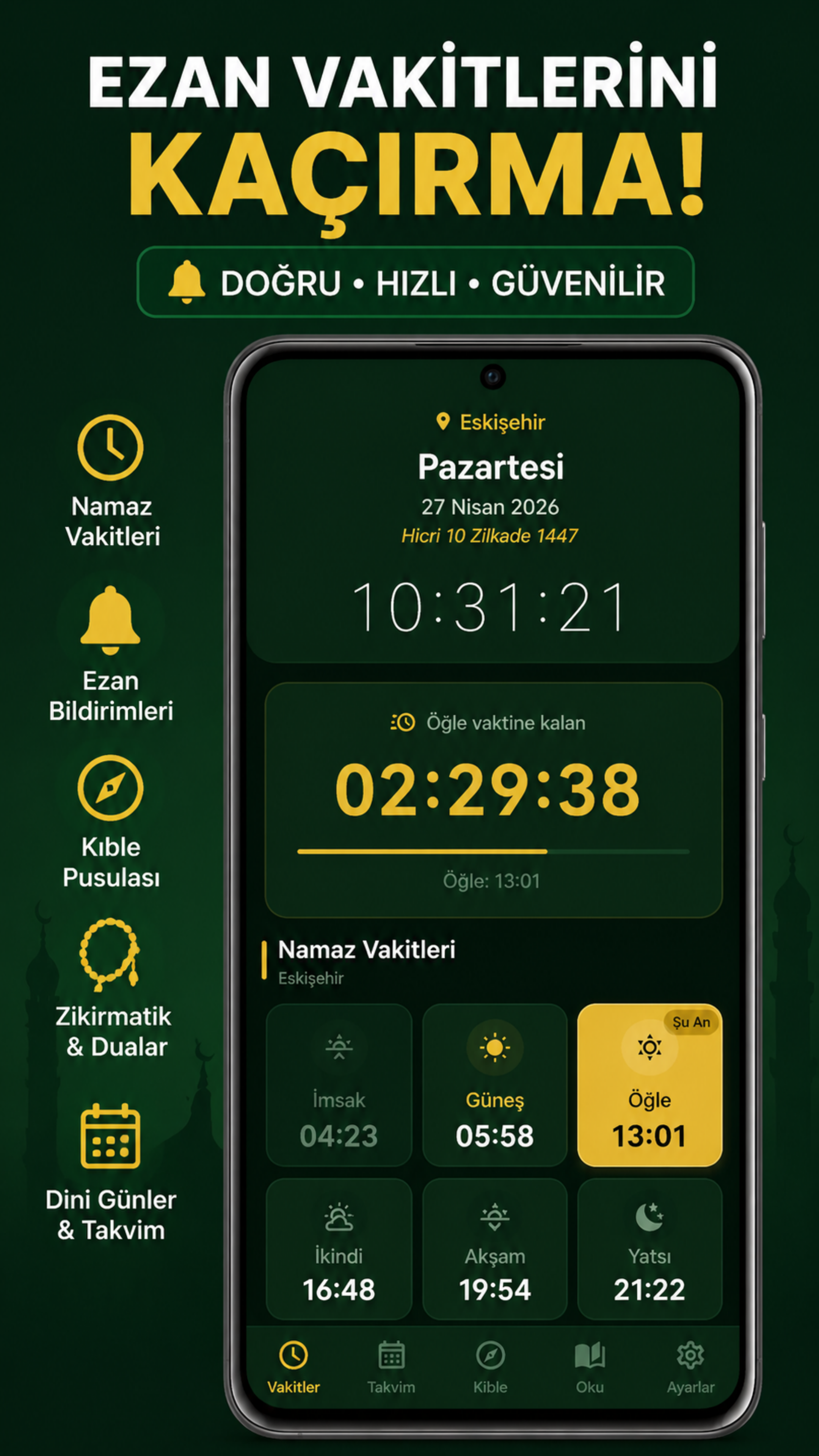 Osmanlı'nın asaletini zümrüt yeşiliyle buluşturan, modern ve sade arayüzüyle ibadetlerinize eşlik eden en şık namaz vakti uygulaması.