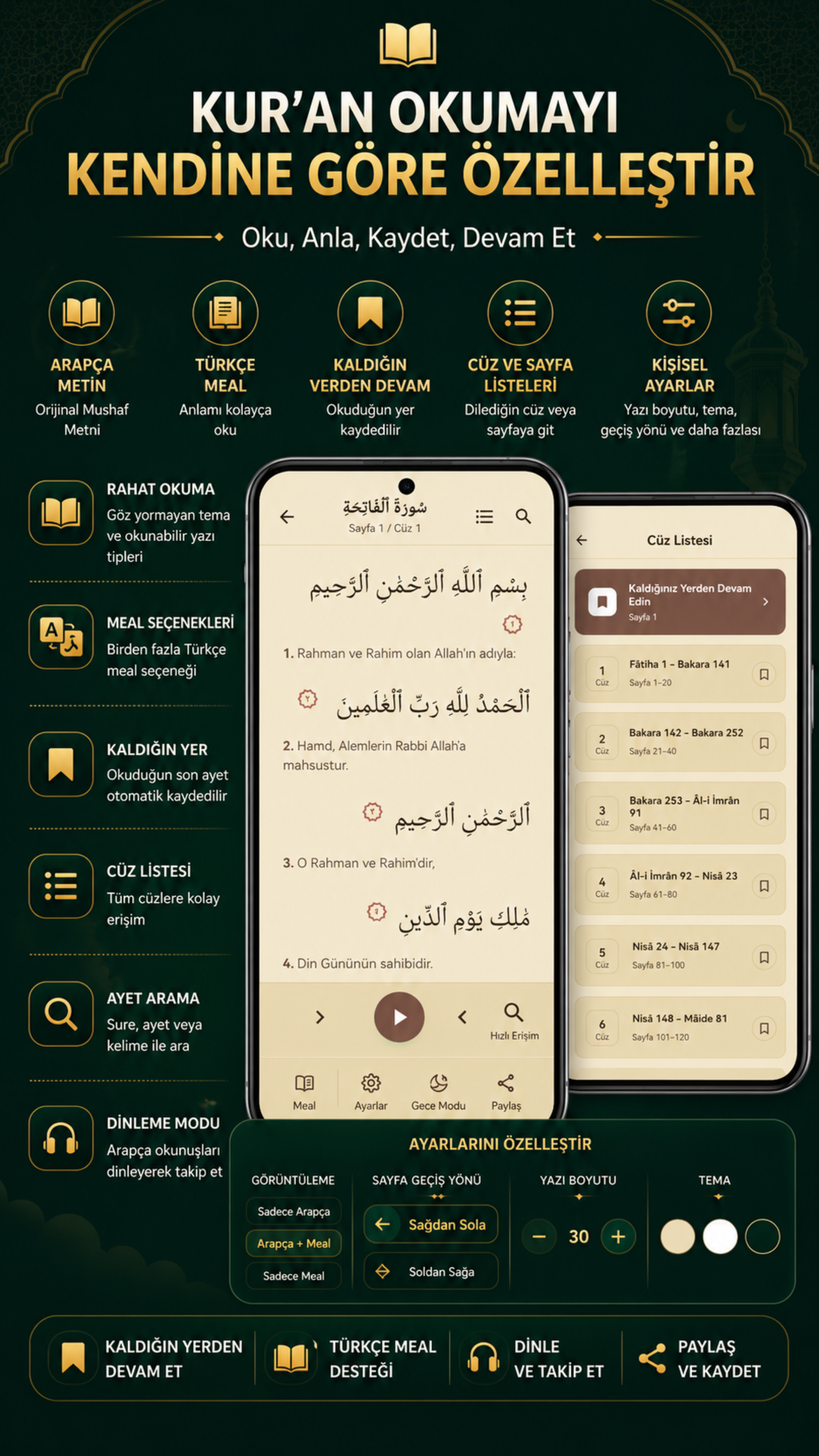 Mushaf görünümü ile Kur'an-ı Kerim okuyun, ayetlerin meallerine kolayca ulaşın.